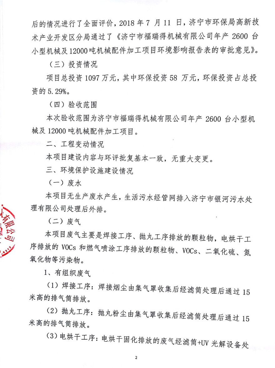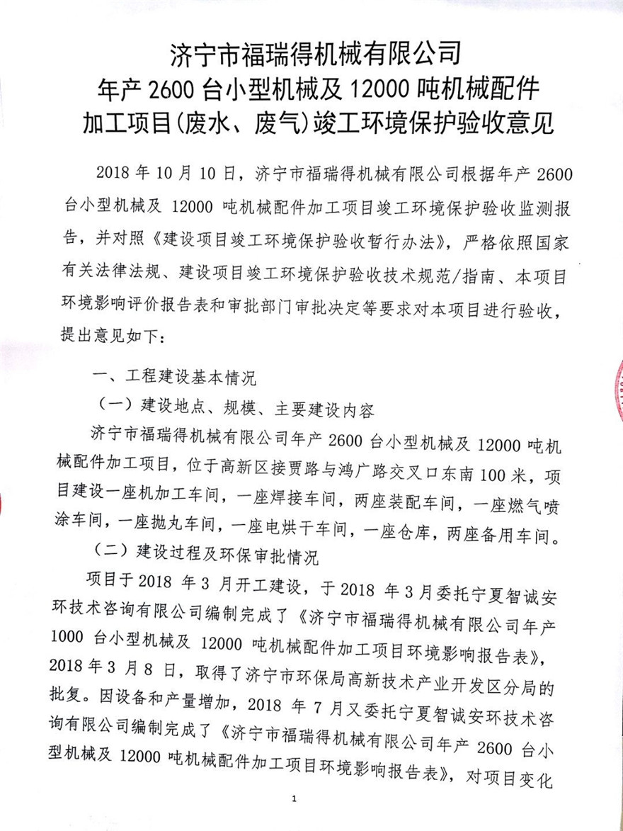 济宁市福瑞得机械有限公司年产2600台小型机械及12000吨机械配件加工项目(废气、废水)竣