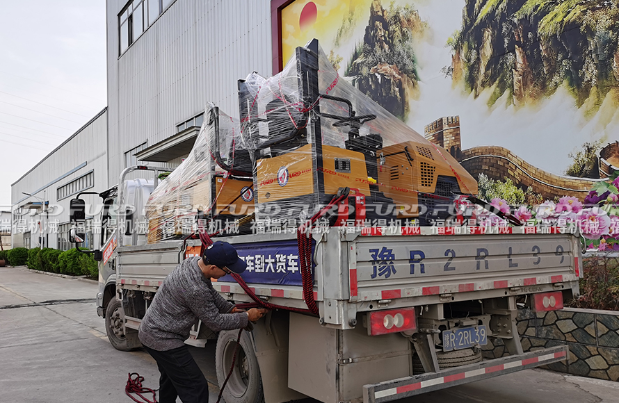4月23日,福瑞得机械将日照客户十天前订购的7台1吨全液压振动压路机装车发走。