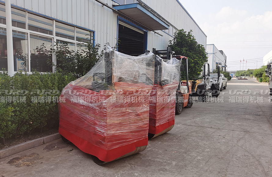 8月6日,福瑞得机械2台1吨座驾双钢轮压路机打包装车发往浙江。